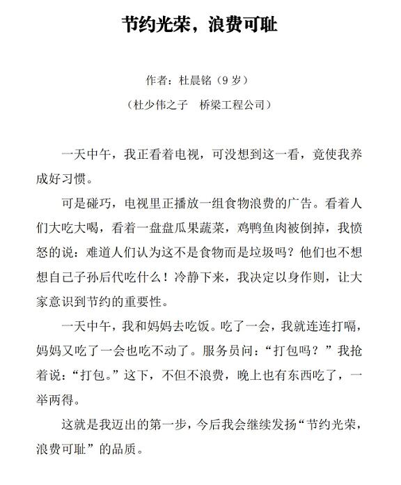 勤儉節(jié)約與愛惜糧食,自古以來是中華民族的優(yōu)良傳統(tǒng),在言傳身教中代代相承。青少年是祖國的未來、民族的希望,為深入貫徹落實(shí)習(xí)近平新時代中國特色社會主義思想,特別是習(xí)近平總書記關(guān)于加強(qiáng)促青少年成長成才等一系列重要論述,進(jìn)一步引導(dǎo)廣大青少年積極培育和踐行社會主義核心價值觀,寧夏公路橋梁建設(shè)有限公司面向員工子女開展“厲行節(jié)約、反對浪費(fèi)”有獎?wù)魑?、書法、美術(shù)比賽活動,傳承節(jié)儉惜食的中華民族傳統(tǒng)。10月22日本次比賽活動圓滿結(jié)束,共有參賽作品32個,其中征文作品14篇,美術(shù)作品14幅,書法作品4幅,經(jīng)評委評分,共選出征文小學(xué)組一等獎2個,中學(xué)組一等獎2個;美術(shù)幼兒組一等獎1個,小學(xué)組一等獎1個,中學(xué)組一等獎1個;由于書法參與人數(shù)較少,均給予優(yōu)秀獎;其他參賽作品分別給予參與獎。
