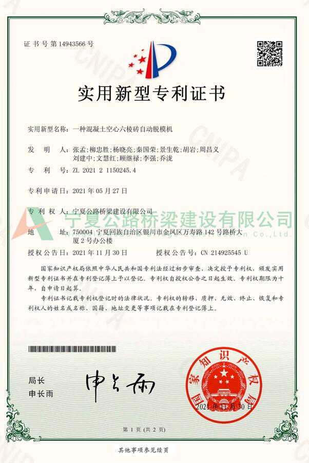 實(shí)用新型專利:一種混凝土空心六棱磚自動(dòng)脫模機(jī)