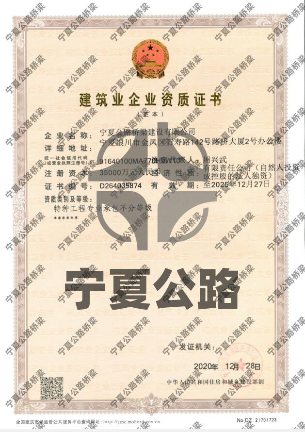 寧夏公路橋梁建設(shè)有限公司建筑業(yè)企業(yè)資質(zhì)證書