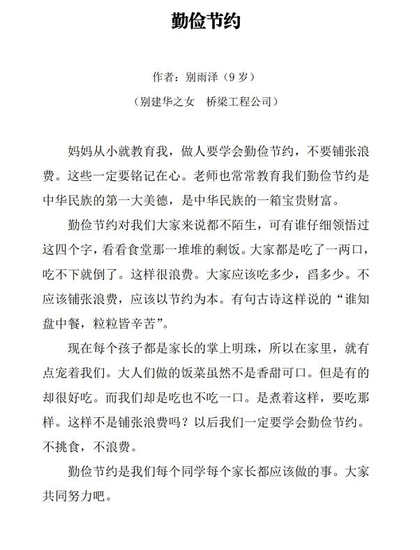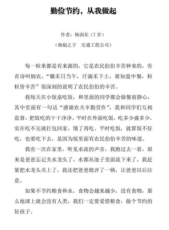 勤儉節(jié)約與愛惜糧食,自古以來是中華民族的優(yōu)良傳統(tǒng),在言傳身教中代代相承。青少年是祖國的未來、民族的希望,為深入貫徹落實(shí)習(xí)近平新時(shí)代中國特色社會(huì)主義思想,特別是習(xí)近平總書記關(guān)于加強(qiáng)促青少年成長成才等一系列重要論述,進(jìn)一步引導(dǎo)廣大青少年積極培育和踐行社會(huì)主義核心價(jià)值觀,寧夏公路橋梁建設(shè)有限公司面向員工子女開展“厲行節(jié)約、反對浪費(fèi)”有獎(jiǎng)?wù)魑?、書法、美術(shù)比賽活動(dòng),傳承節(jié)儉惜食的中華民族傳統(tǒng)。10月22日本次比賽活動(dòng)圓滿結(jié)束,共有參賽作品32個(gè),其中征文作品14篇,美術(shù)作品14幅,書法作品4幅,經(jīng)評委評分,共選出征文小學(xué)組一等獎(jiǎng)2個(gè),中學(xué)組一等獎(jiǎng)2個(gè);美術(shù)幼兒組一等獎(jiǎng)1個(gè),小學(xué)組一等獎(jiǎng)1個(gè),中學(xué)組一等獎(jiǎng)1個(gè);由于書法參與人數(shù)較少,均給予優(yōu)秀獎(jiǎng);其他參賽作品分別給予參與獎(jiǎng)。