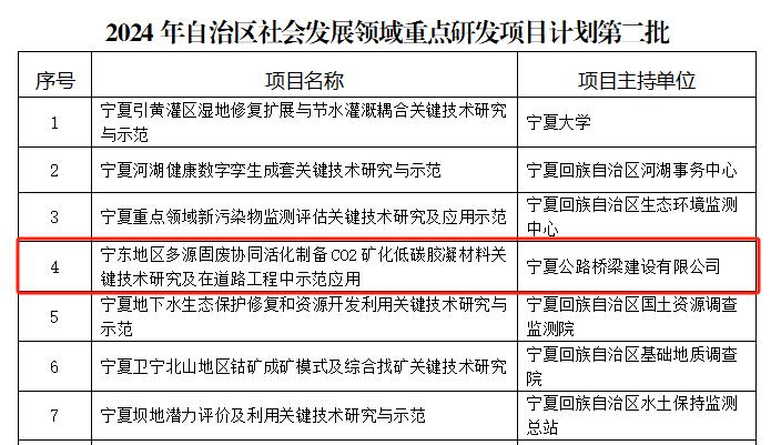 近日,寧夏回族自治區(qū)科學技術(shù)廳下達了《2024年社會發(fā)展領(lǐng)域重點研發(fā)項目第二批計劃的通知》,由公司主持申報的《寧東地區(qū)多源固廢協(xié)同活化制備CO2礦化低碳膠凝材料關(guān)鍵技術(shù)研究及在道路工程中示范應用》項目經(jīng)過嚴格評審與層層篩選,由寧夏回族自治區(qū)科學技術(shù)廳批準,順利立項。